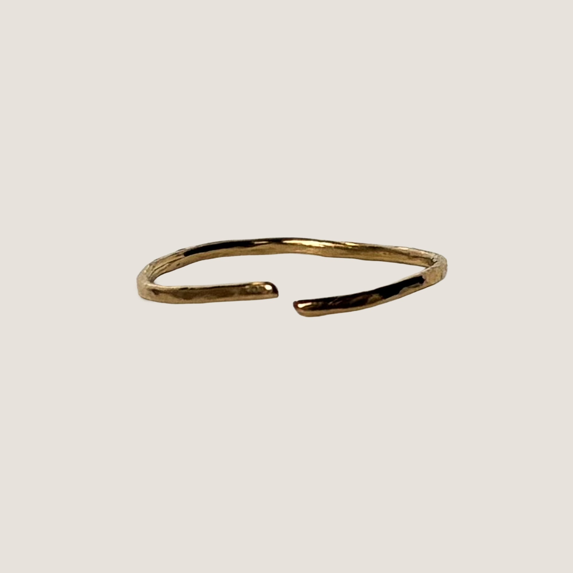 K18の金線を丸め、叩きながらかたちを整えたリングです。